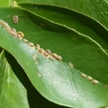 Schildluizen lijken qua uiterlijk op dopluizen, maar zijn net iets kleiner. De luizen zijn slechts 1 tot 3 millimeter groot. Ze bevinden zich vaak in groepen bij elkaar op de onderkant van een blad of op de stam. Je kunt schildluis herkennen aan het hoornachtige schild waarmee hij zichzelf beschermt. Wanneer de luis zich op jouw kamerplant bevindt, zuigt hij zich vast aan het blad.