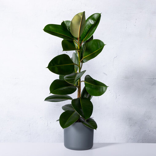 De rubberboom, Ficus elastica ‘Robusta’, is een sterke luchtzuiverende plant die tegen een stootje kan. De Rubberboom heeft indrukwekkende bladeren, is een sterke plant en komt van oorsprong uit Zuid-Amerika. Ben je geen kei in verzorging? Zelfs dan zal deze kamerplant overleven!